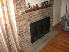 The fireplace had a big ugly device ("heatilator," Uncle Kreamo called it) that was supposed to circulate heat from a fire. All it did was blow soot, from the looks of the hearth, and drive me NUTS. It turned out to be a little more work than anticipated to take the whole filthy thing out. It involved a hammer, a screwdriver, scissors and a flashlight. But now the living room is irritation-free.